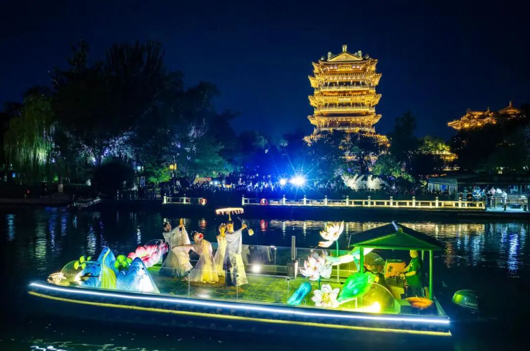 大明湖景区推出中秋主题活动,“画船演艺”上演中秋特别节目,以乐曲舞蹈讲述中秋传说,营造美轮美奂的湖上意境。